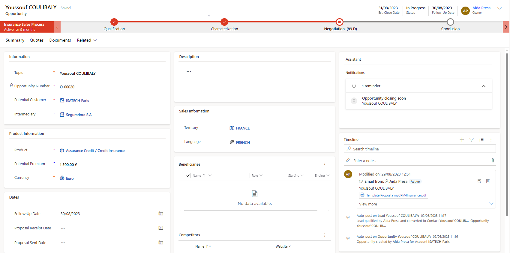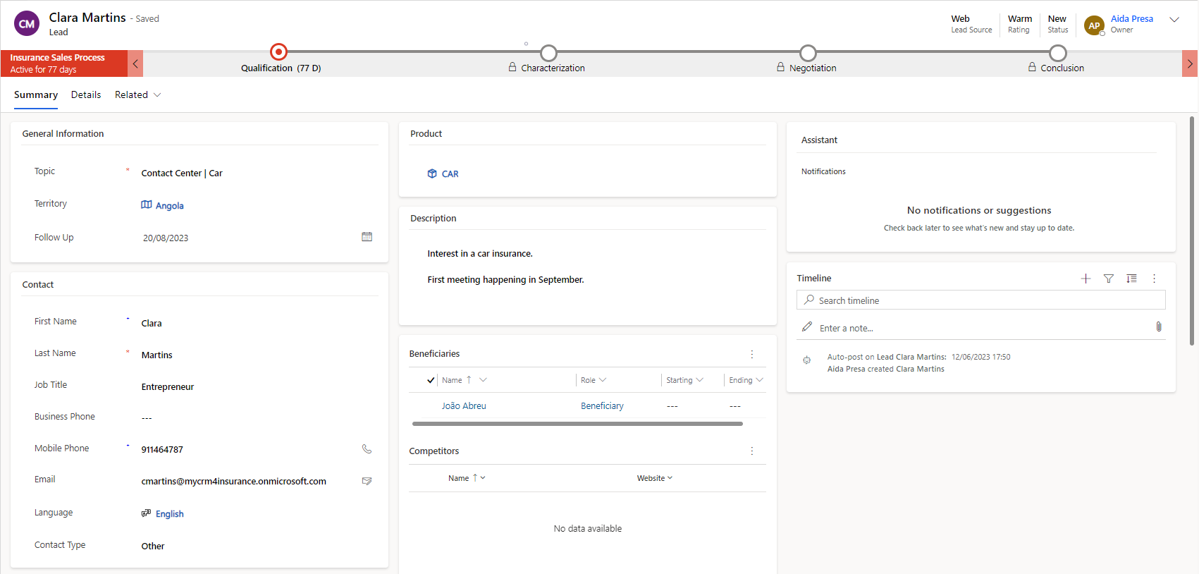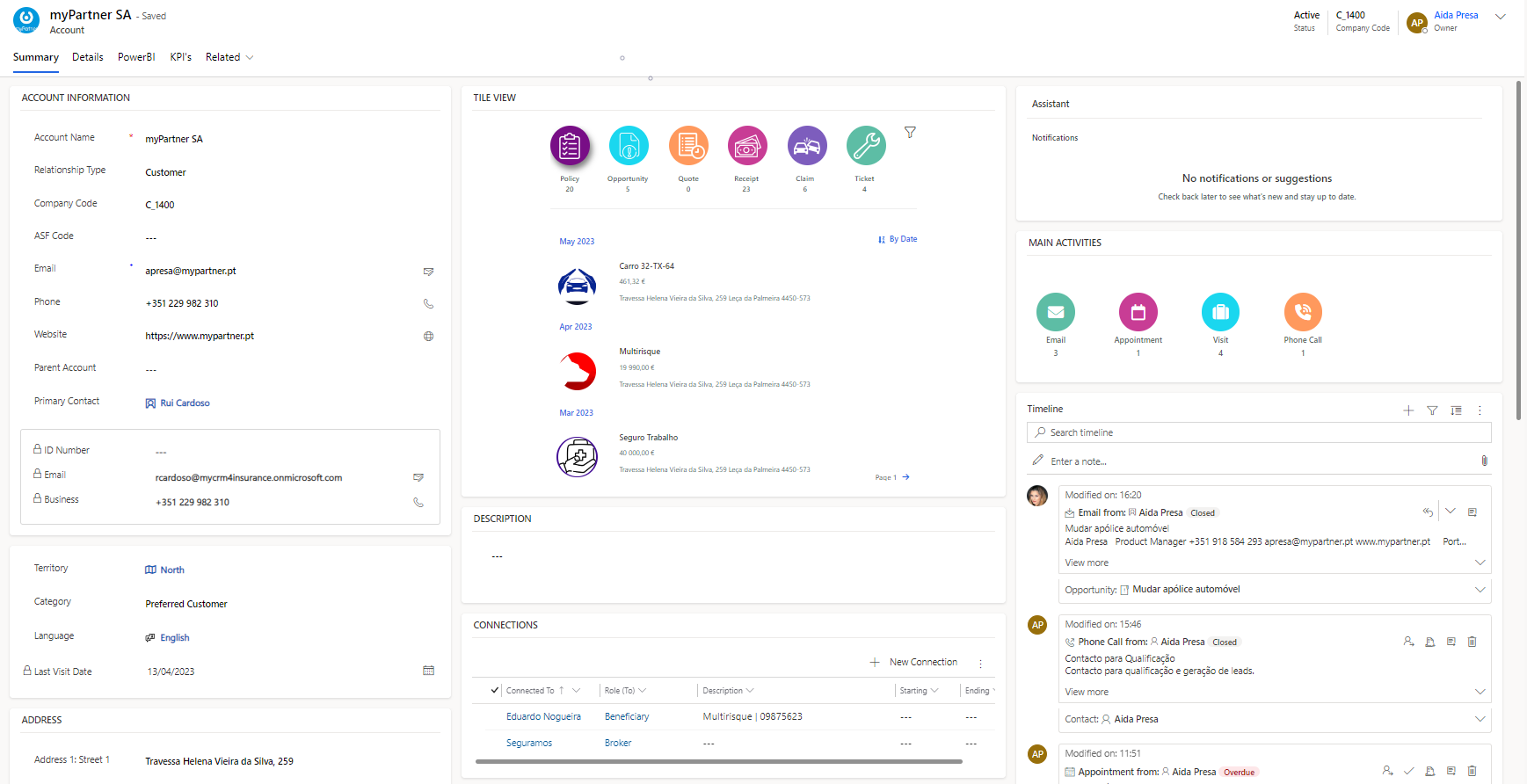 • Representação visual e temporal do contacto com visualização de todas as Chamadas, Oportunidades, Propostas, Políticas, Recibos, Reclamações e Tickets, com filtragem de registos.