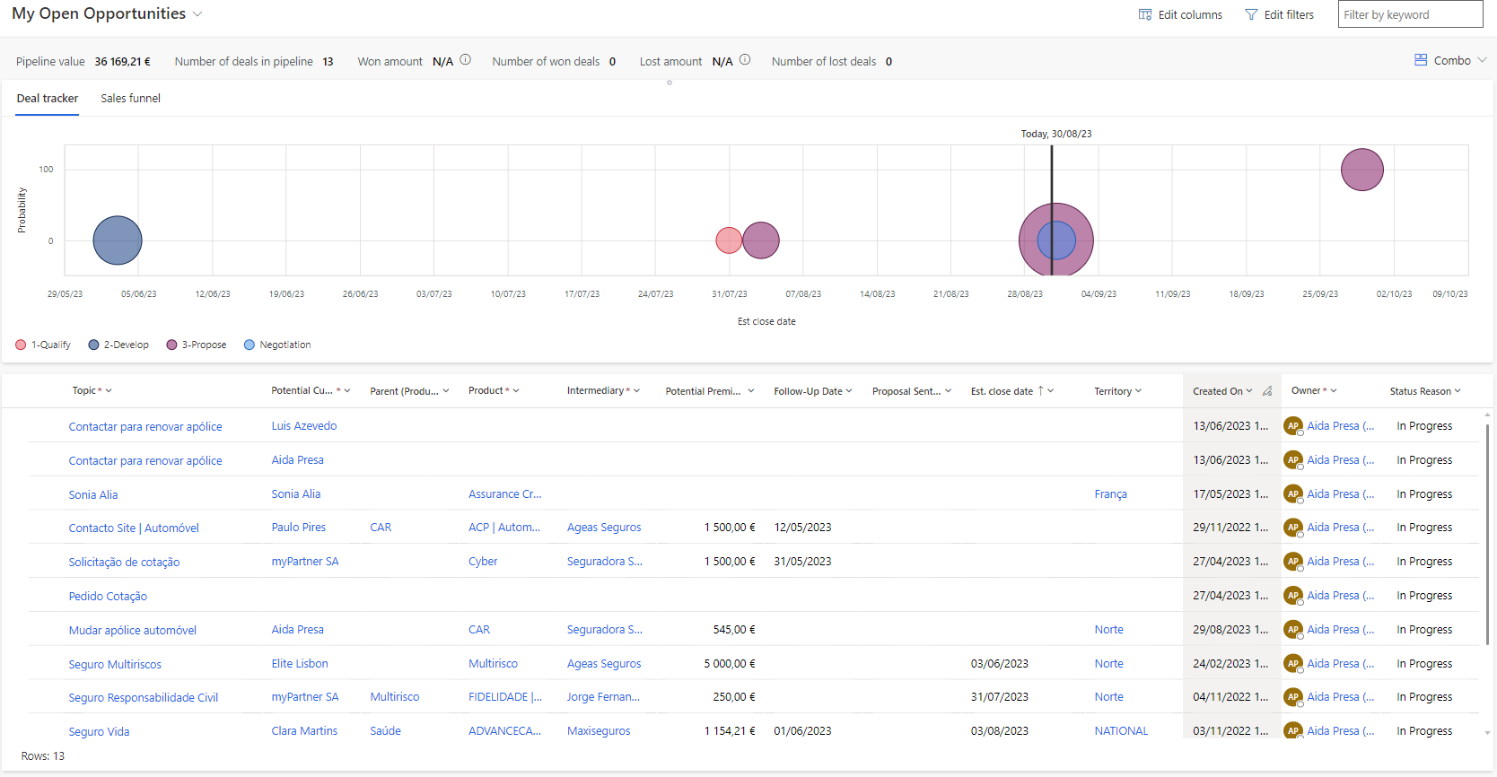 Processos de venda, desde a lead até à cotação e fecho da apólice, reunindo toda a comunicação e documentação gerada durante o processo. Acompanhamento dos objetivos das equipas de venda.