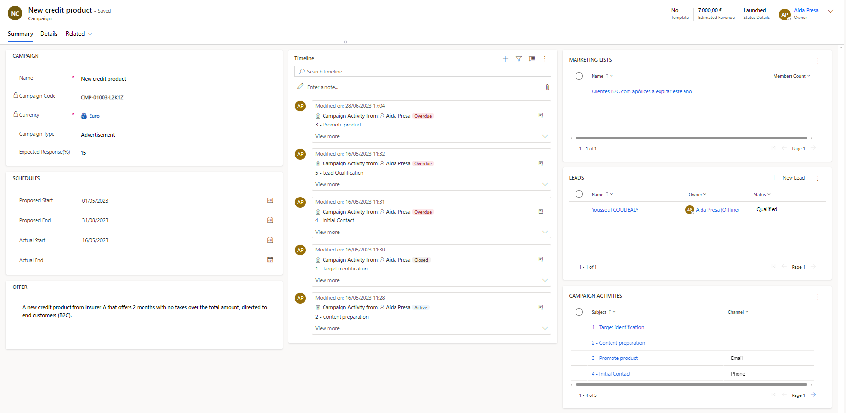 Contas e contactos, leads e oportunidades, propostas e reclamações são algumas das entidades no CRM onde pode ver uma linha temporal cronológica de todas as actividades e interações.