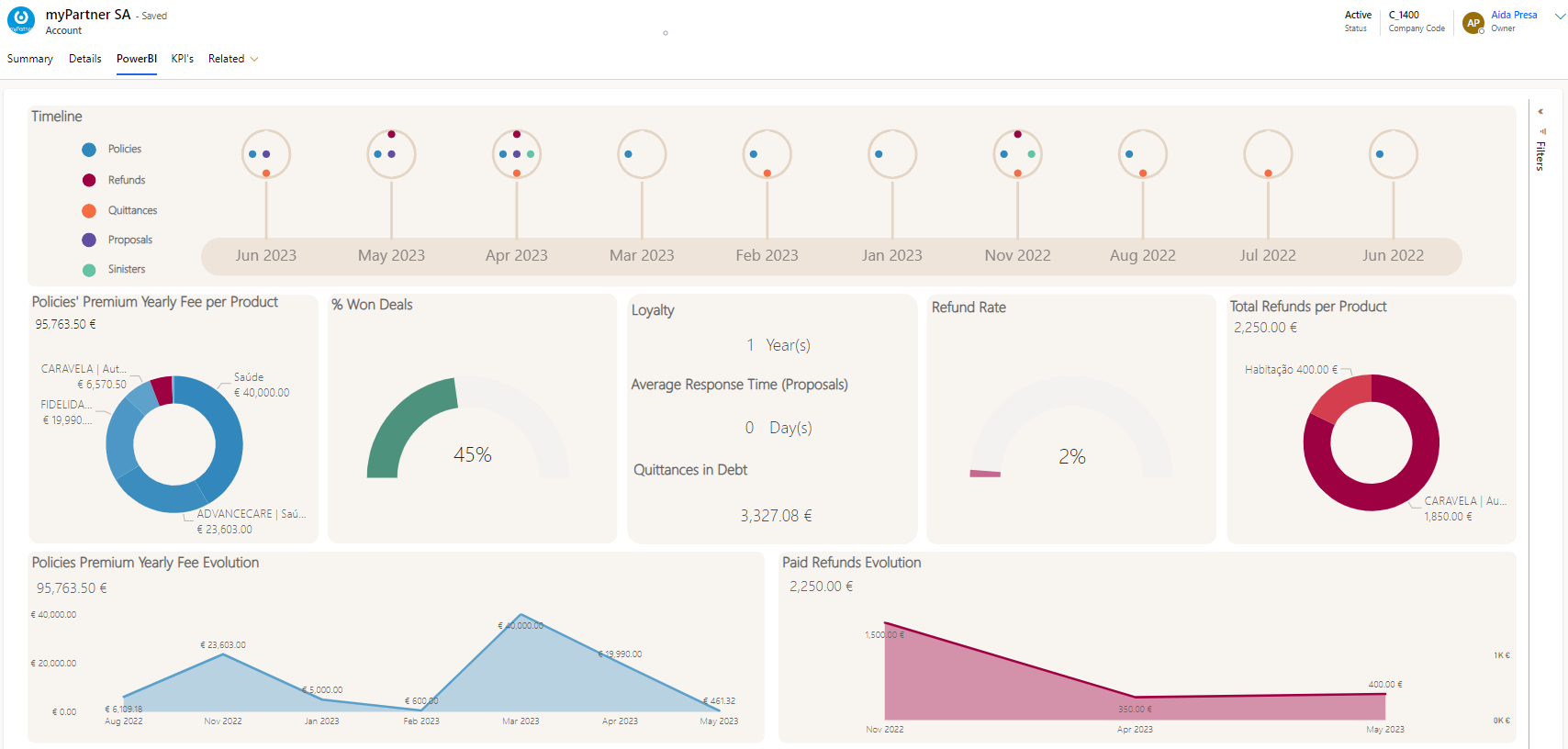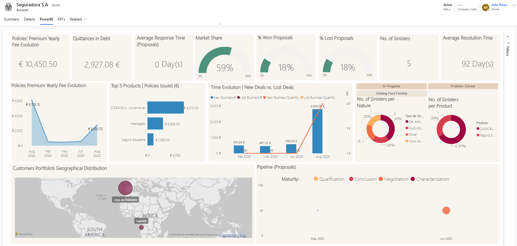 • Dashboard Global: Painel de monitorização global do negócio com KPI’s de Novos Negócios vs. Apólices Canceladas, TOP 10 Produtos, TOP 10 Clientes, Portfólio, Prémios por Produto e Gestor de Vendas e Desempenho da Equipa.